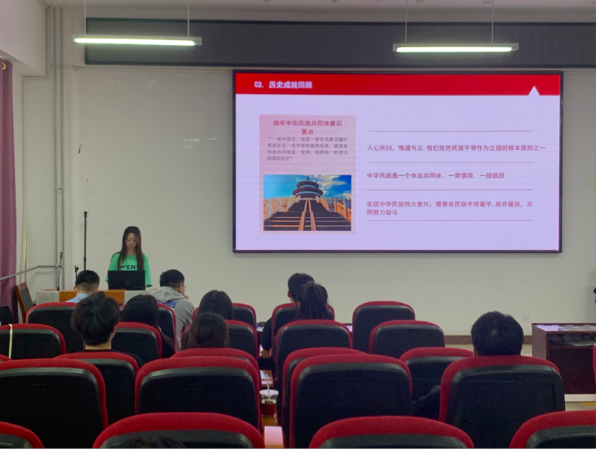 活动中,由杨子涵同学从“什么是民族团结、我国民族政策、关于中华民族共同体、铸牢中华民族共同体意识”四方面入手,通过通俗的语言、生动的事例向大家宣传并讲解民族理论知识,吸引了众多积极分子们踊跃发言,分享了生活中看到、听到、经历的关于各族群众相亲相爱、互相帮助的故事。最后,通过结合主题为大家设置了相关知识游戏,同学们积极参与,热情高涨,将活动的氛围感“拉满”,让民族团结之花开在每一位同学的心中,让铸牢中华民族共同体意识内化于心,外化于行,为同学们树立中华民族一家亲的思想奠定基础。