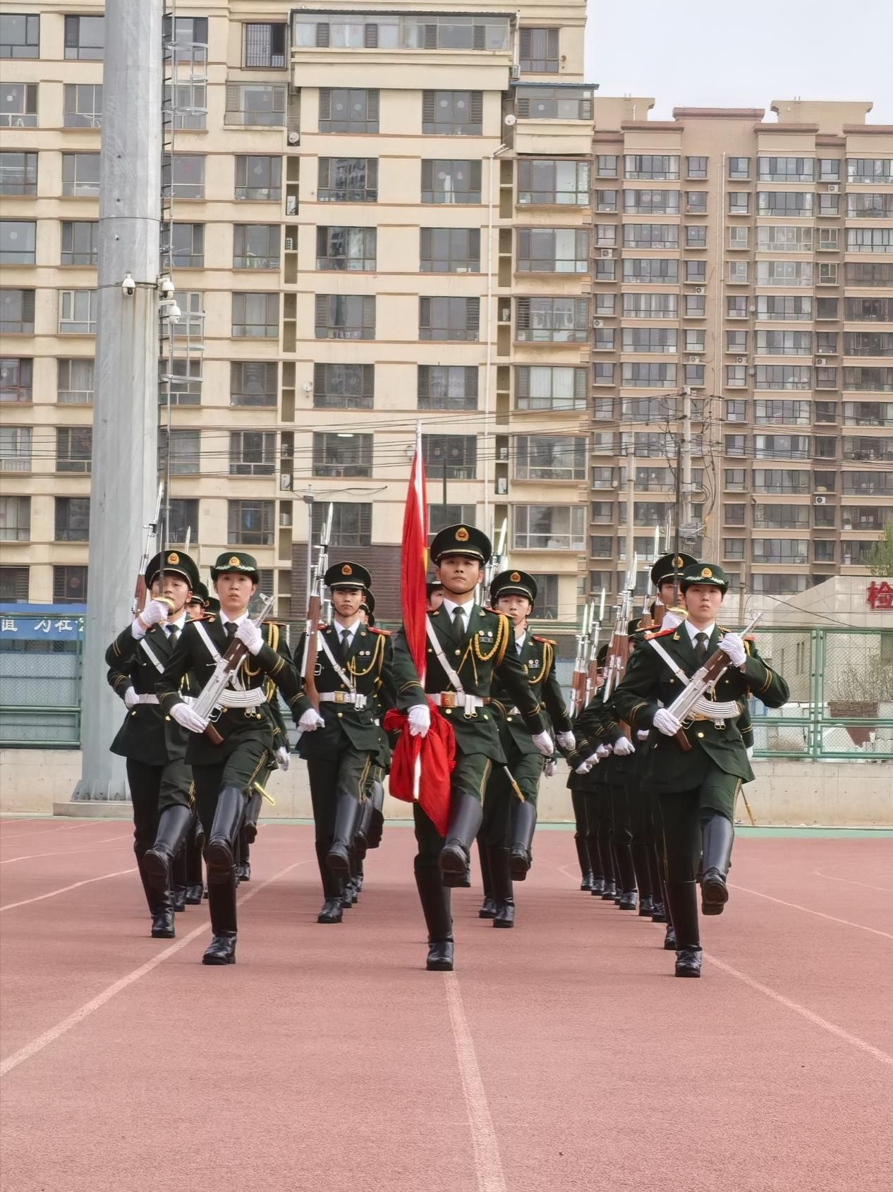 英姿飒爽的国旗护卫队迈着整齐有力的步伐护送国旗走向升旗台。随着雄壮的国歌声响起,鲜艳的五星红旗缓缓升起,全体师生庄严肃立,面向国旗行注目礼,现场氛围庄重而肃穆。