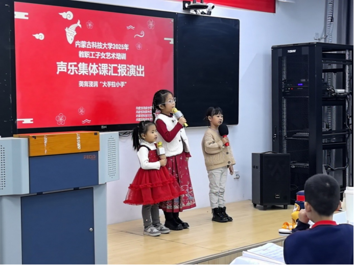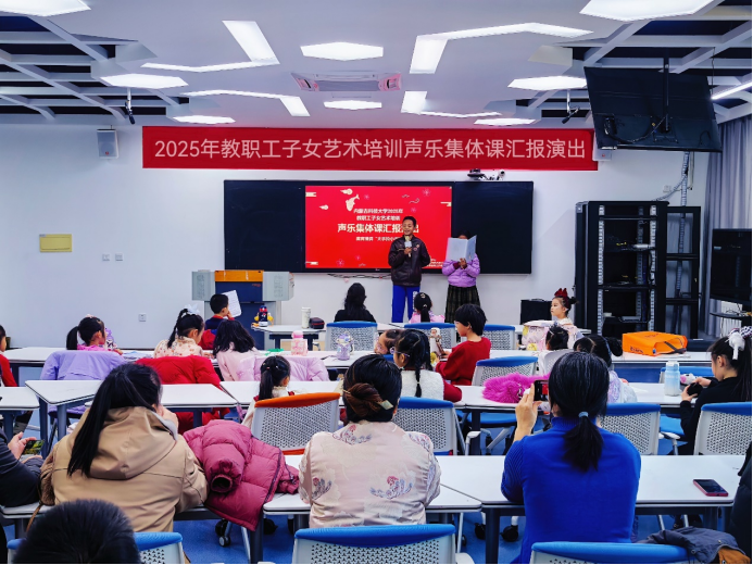 及美育名师工作室联合举办的“童声咏华章 艺韵润科大——2025年教职工子女艺术培训声乐集体课汇报演出”在明德楼H501教室悠扬启幕。20余名小学员身着节日盛装,以清澈童声接力演唱《稻香》、《听我说谢谢你》、《金色童年》等动人旋律。为现场观众献上了一场精彩纷呈的视听盛宴,更为寒冷的冬日注入融融暖意。