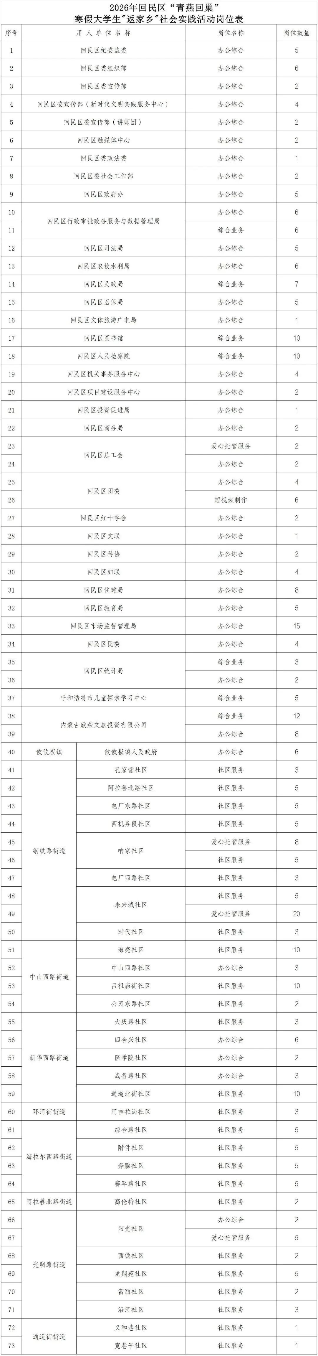 请已在“创青春”上报名的大学生点击下方蓝色字体下载《回民区“青燕回巢”社会实践报名表》,并于2026年1月5日前将电子版发送至回民区团委邮箱:[email protected](邮件标题为回民区“青燕回巢”社会实践申请+姓名”命名)。